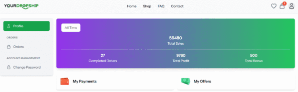 Every user on Yourdropship.com has a personal dashboard. Here you: